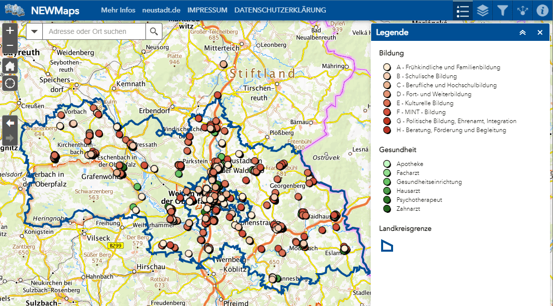 Mithilfe von NEWMaps kann nun die Versorgungslandschaft der Gesundheit, Bildung sowie Mobilität des Landkreises und der Umgebung abgebildet werden. So können im Themenbereich Gesundheit beispielsweise Fachärztinnen und Fachärzte, Apotheken und vieles mehr in der Region gezielt gesucht und aktualisierte Informationen abgerufen werden. Durch die verschiedenen Einfärbungen lassen sich unterschiedliche Themenbereiche in den einzelnen Segmenten unterscheiden. Im Bereich Bildung finden Interessierte Adressen zu Einrichtungen von der frühkindlichen bis hin zur Erwachsenenbildung und Beratungsstellen. Zudem können Daten wie die ÖPNV Anbindung und BAXI-Haltestellen parallel angezeigt werden, um die An- und Abreise zu planen.